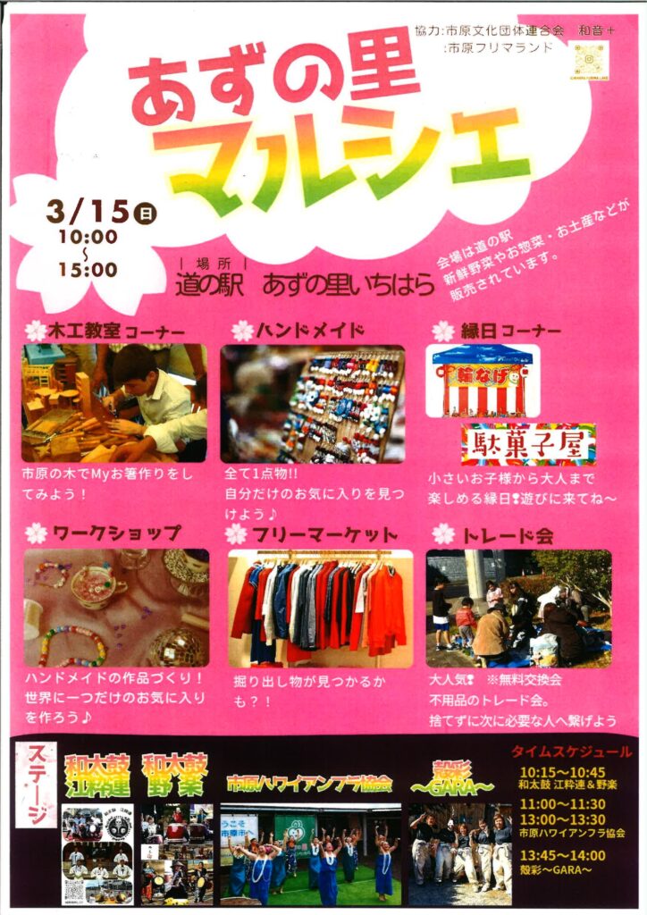 あずの里マルシェ開催のお知らせ投稿日 2026年03月13日(金曜日) 〇3月15日(日)10:00~15:00(雨天中止)・木工教室・ハンドメイド・駄菓子屋・ワークショップ・フリーマーケット・トレード会・和太鼓(江枠連)・フラダンス(市原ハワイアンフラ協会)