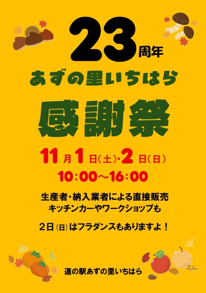 11月イベントのお知らせ投稿日 2025年10月18日(土曜日) あずの里いちはら 感謝祭11/1(土)、11/2(日)10:00~16:00生産者・納入業者による直売会・キッチンカー・ワークショップ11/2(日)は、ウクレレ生演奏&フラ イベント同時開催予定